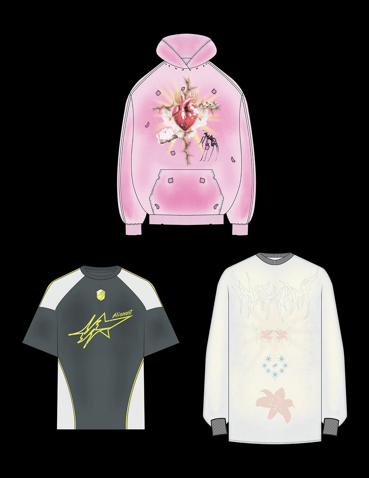 A collection of unused designs done during my internship with the brand Alienant in 2024.