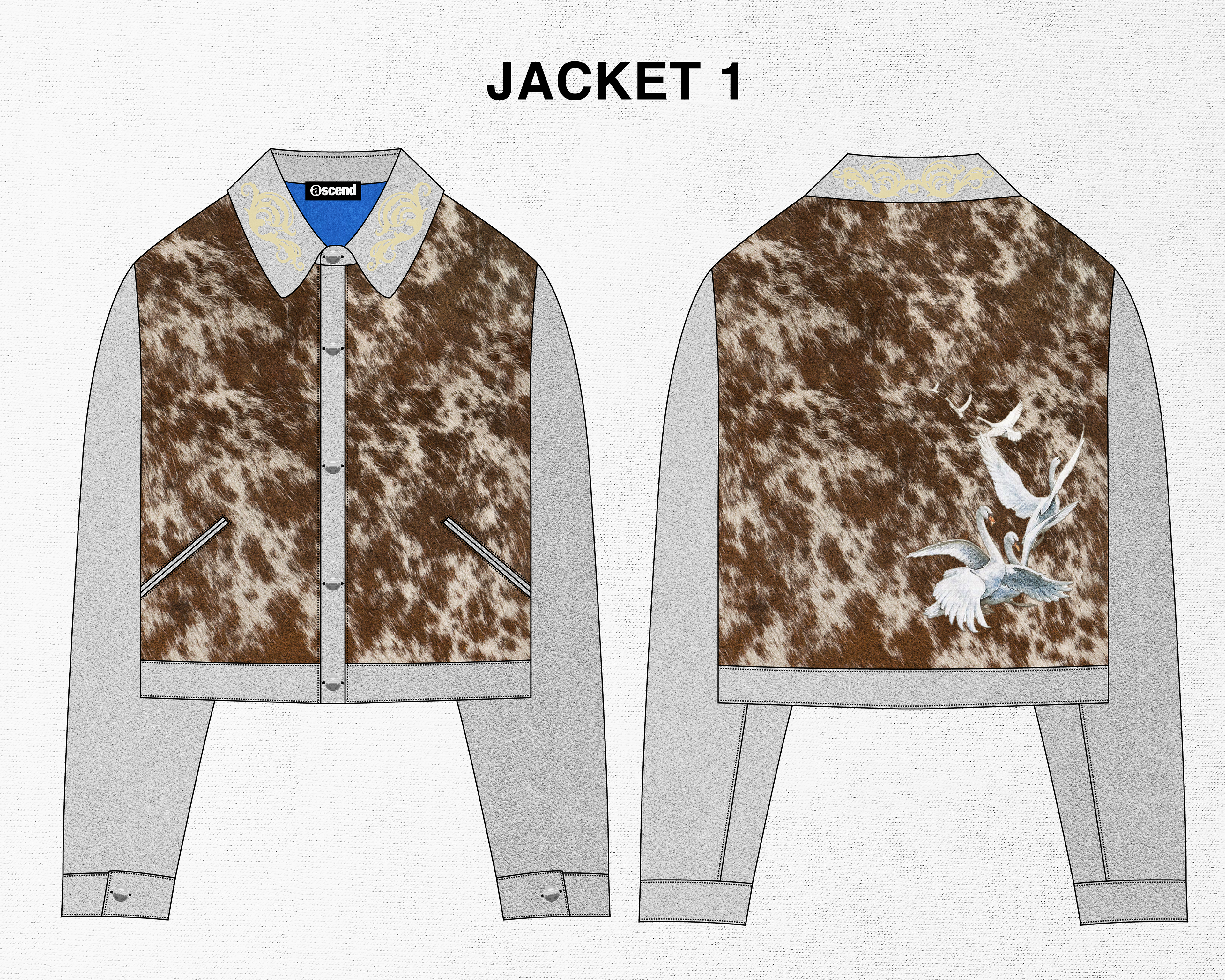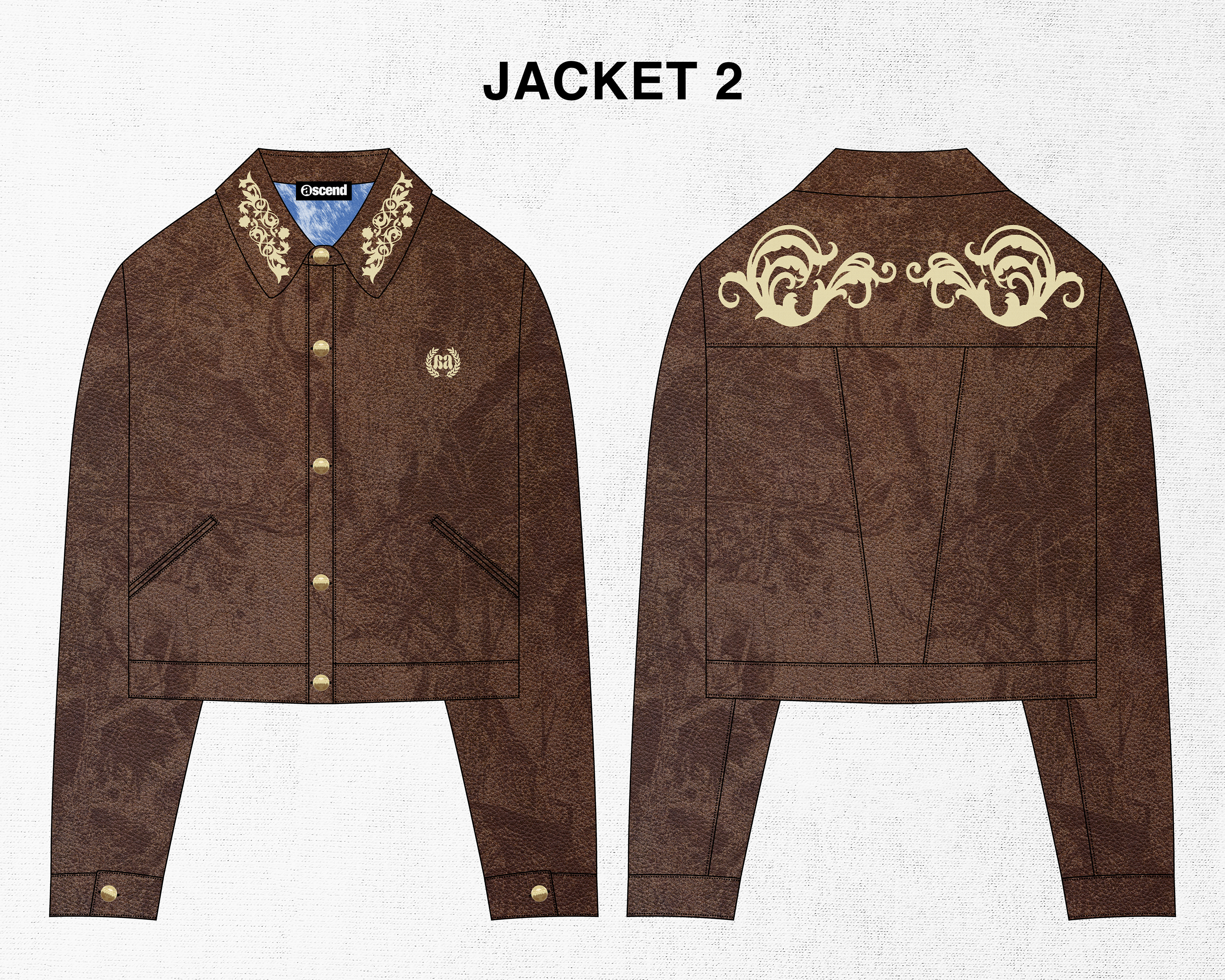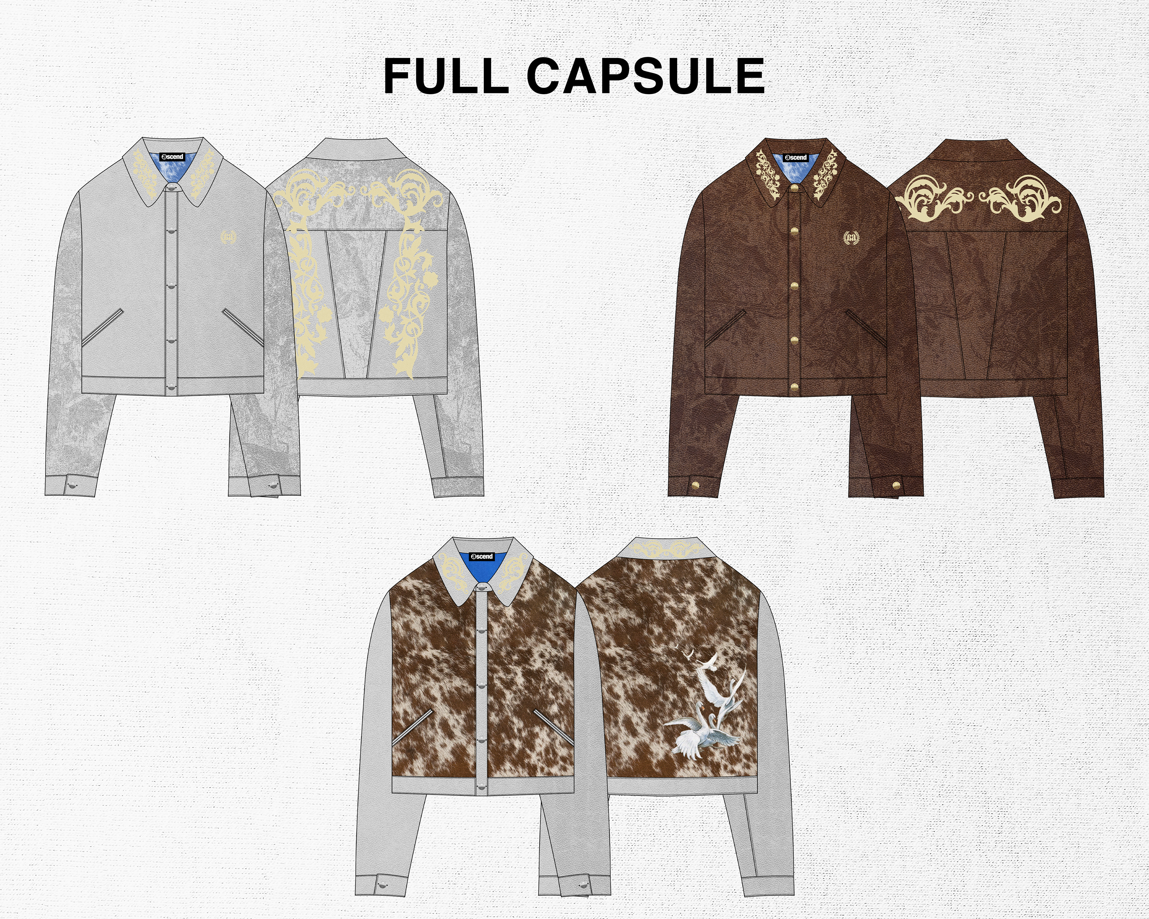 A small concept line of 3 different jackets designed for my brand "Ascend". Taking inspiration from western style jackets, I blended the look with some classic design themes I often use for Ascend. I included lots of details in these jackets such as embroidery, fur, and metal buttons.