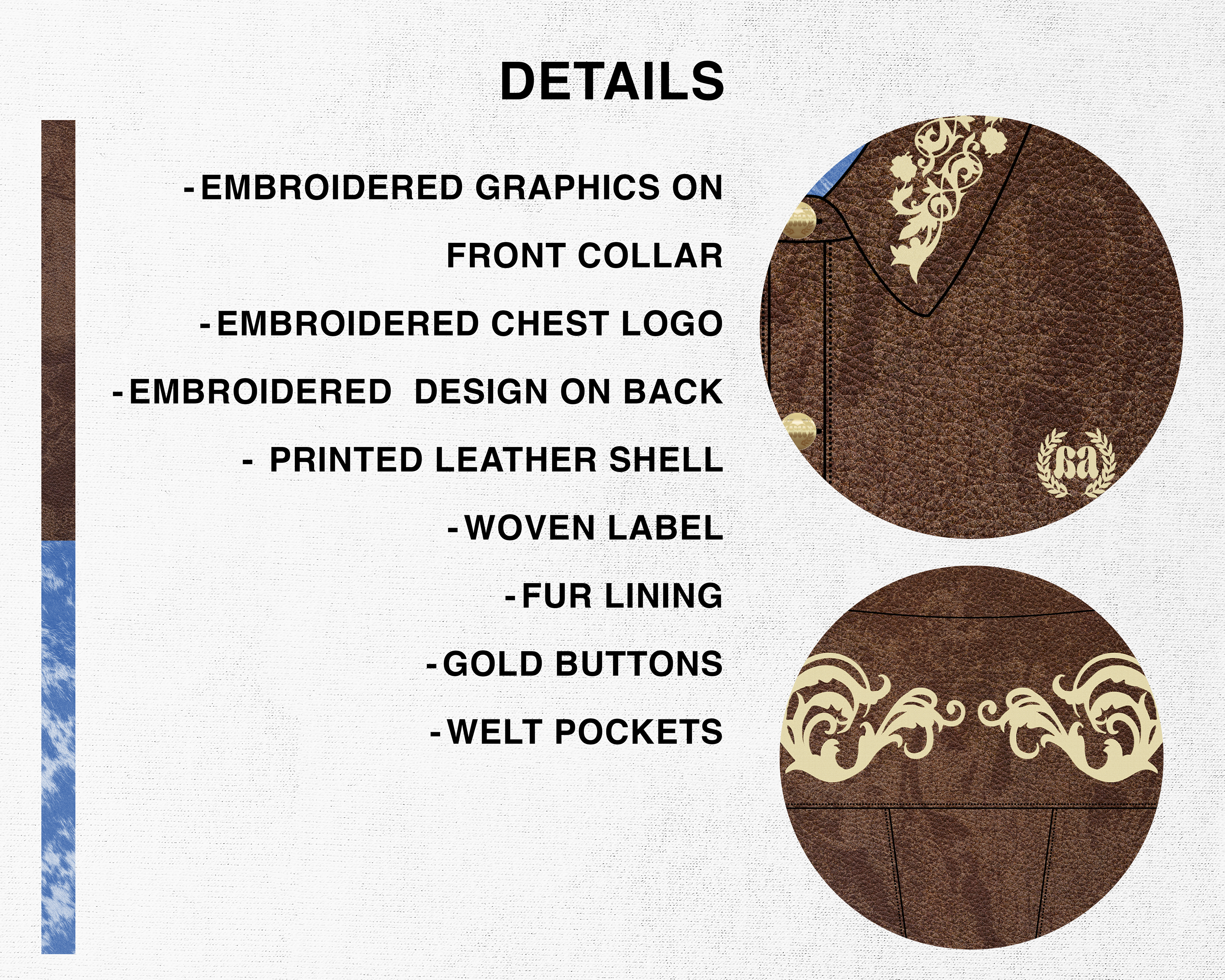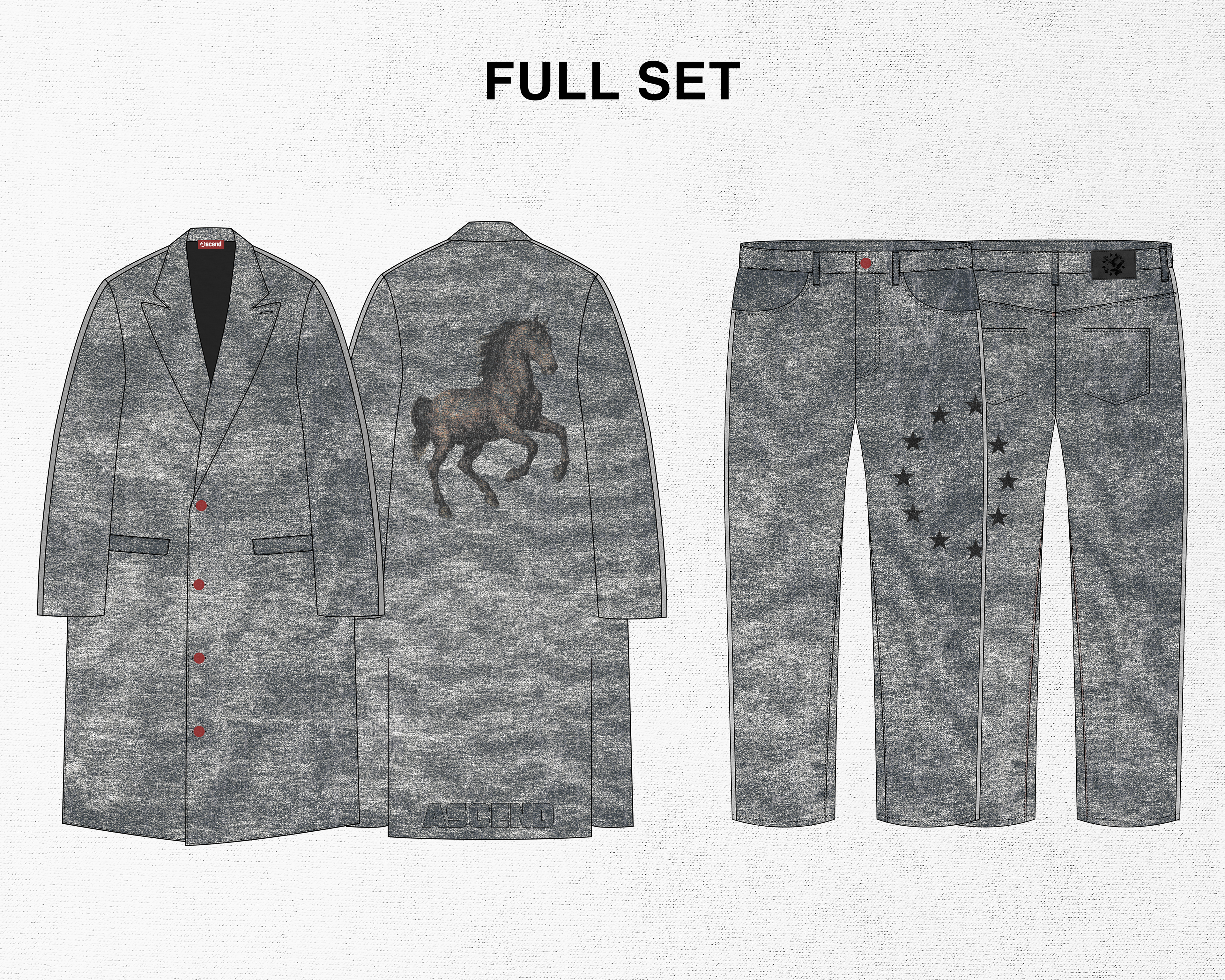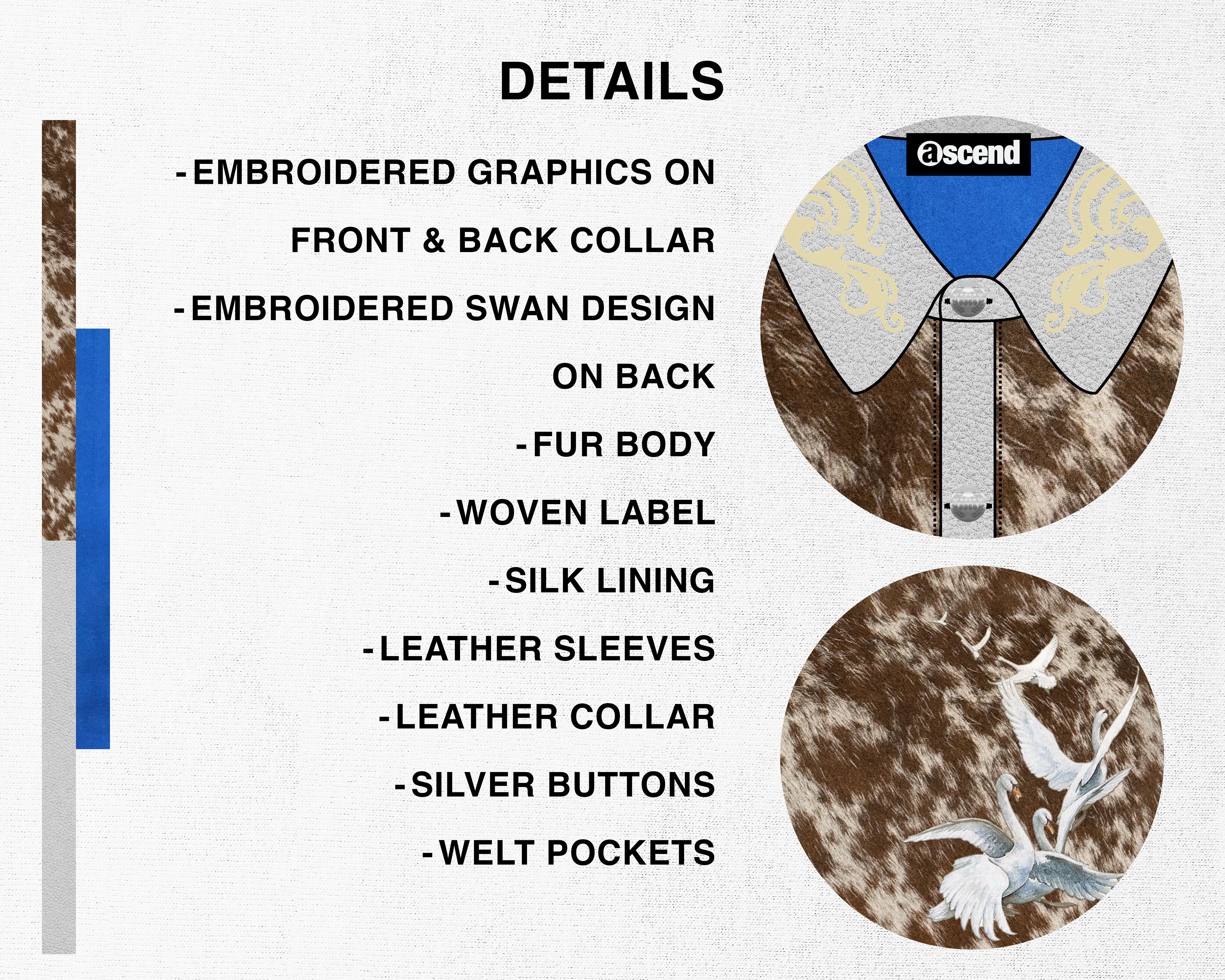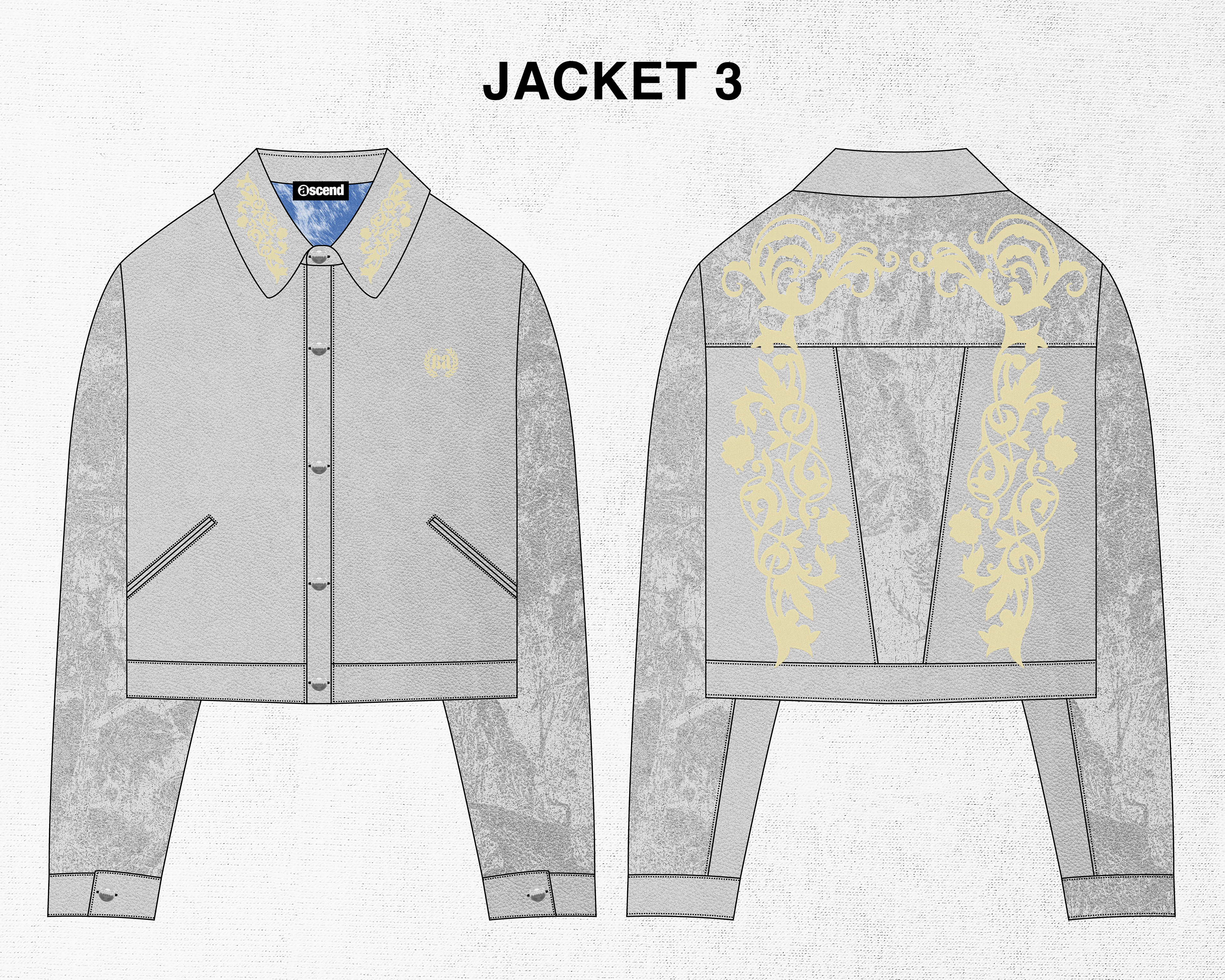 A small concept line of 3 different jackets designed for my brand "Ascend". Taking inspiration from western style jackets, I blended the look with some classic design themes I often use for Ascend. I included lots of details in these jackets such as embroidery, fur, and metal buttons.