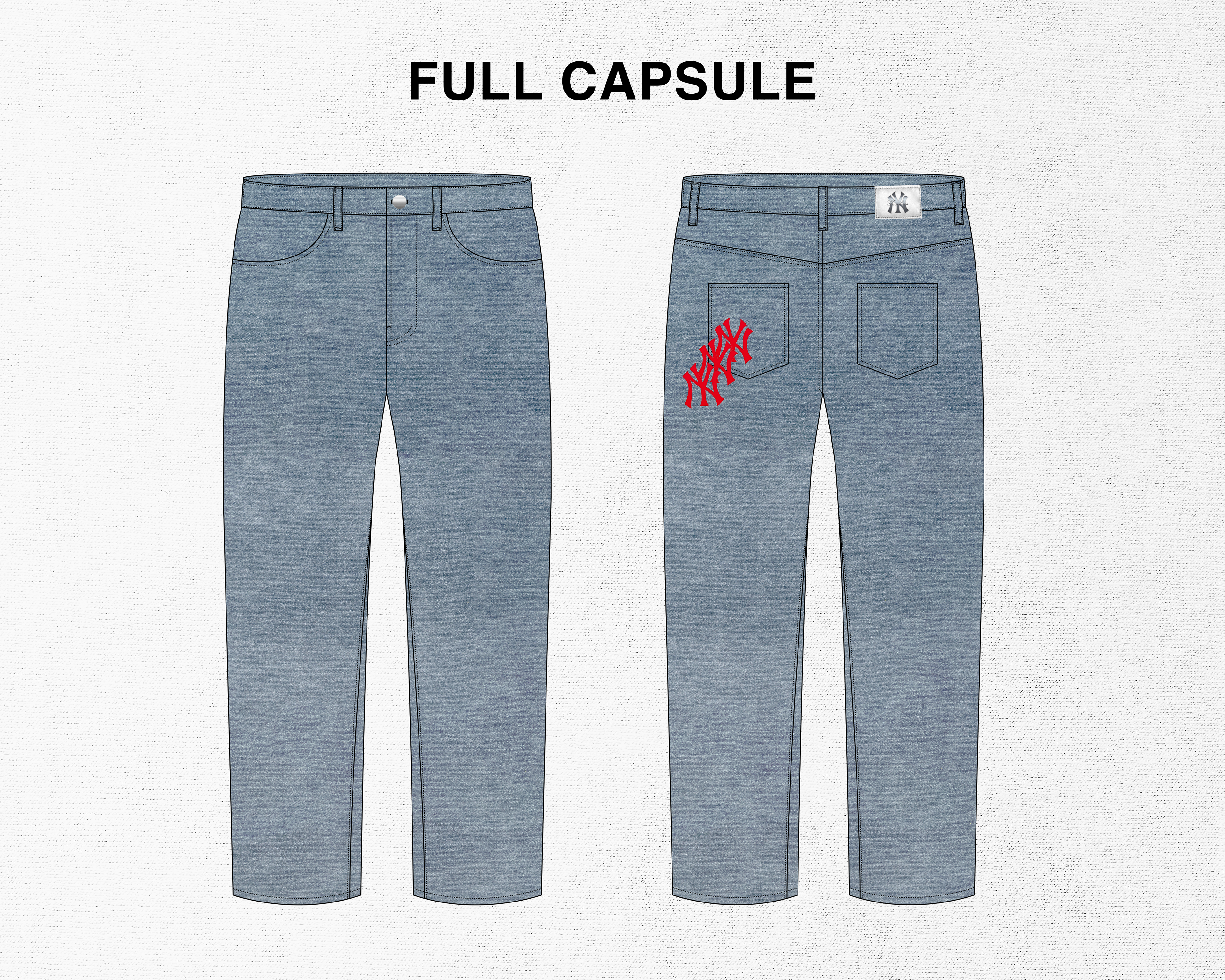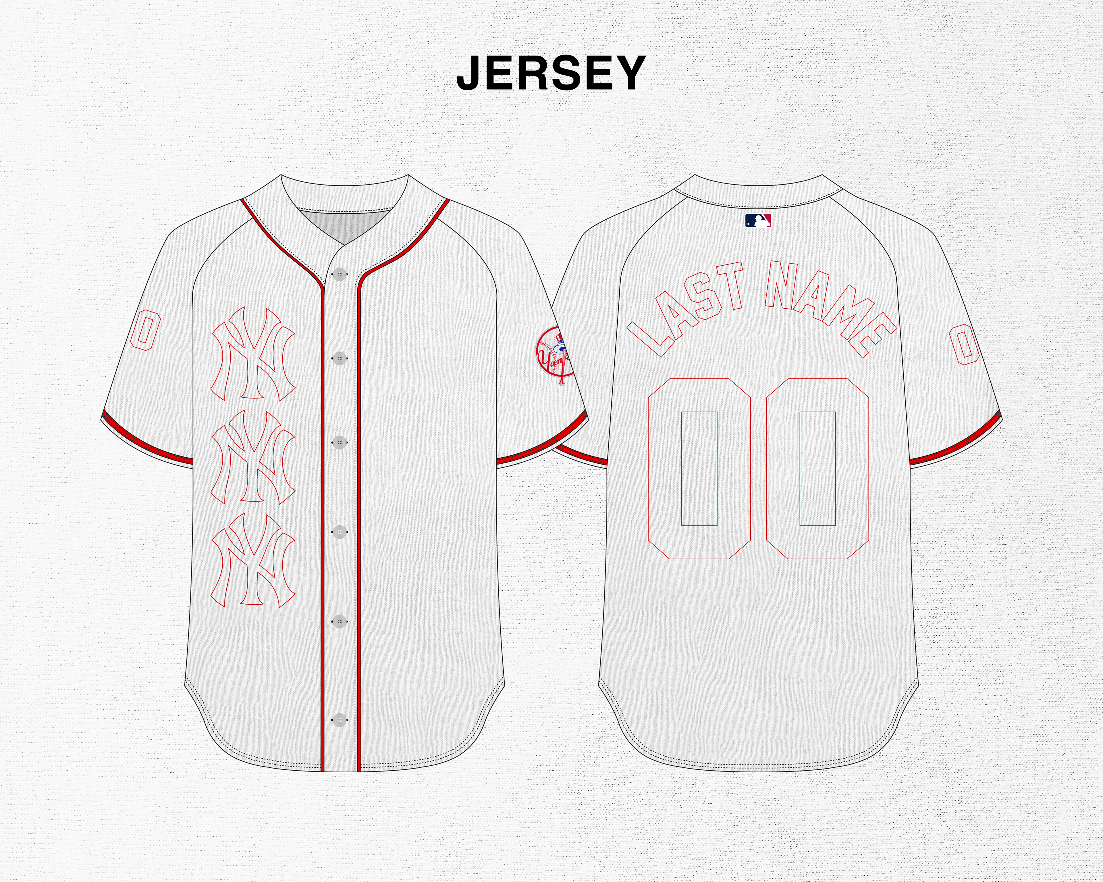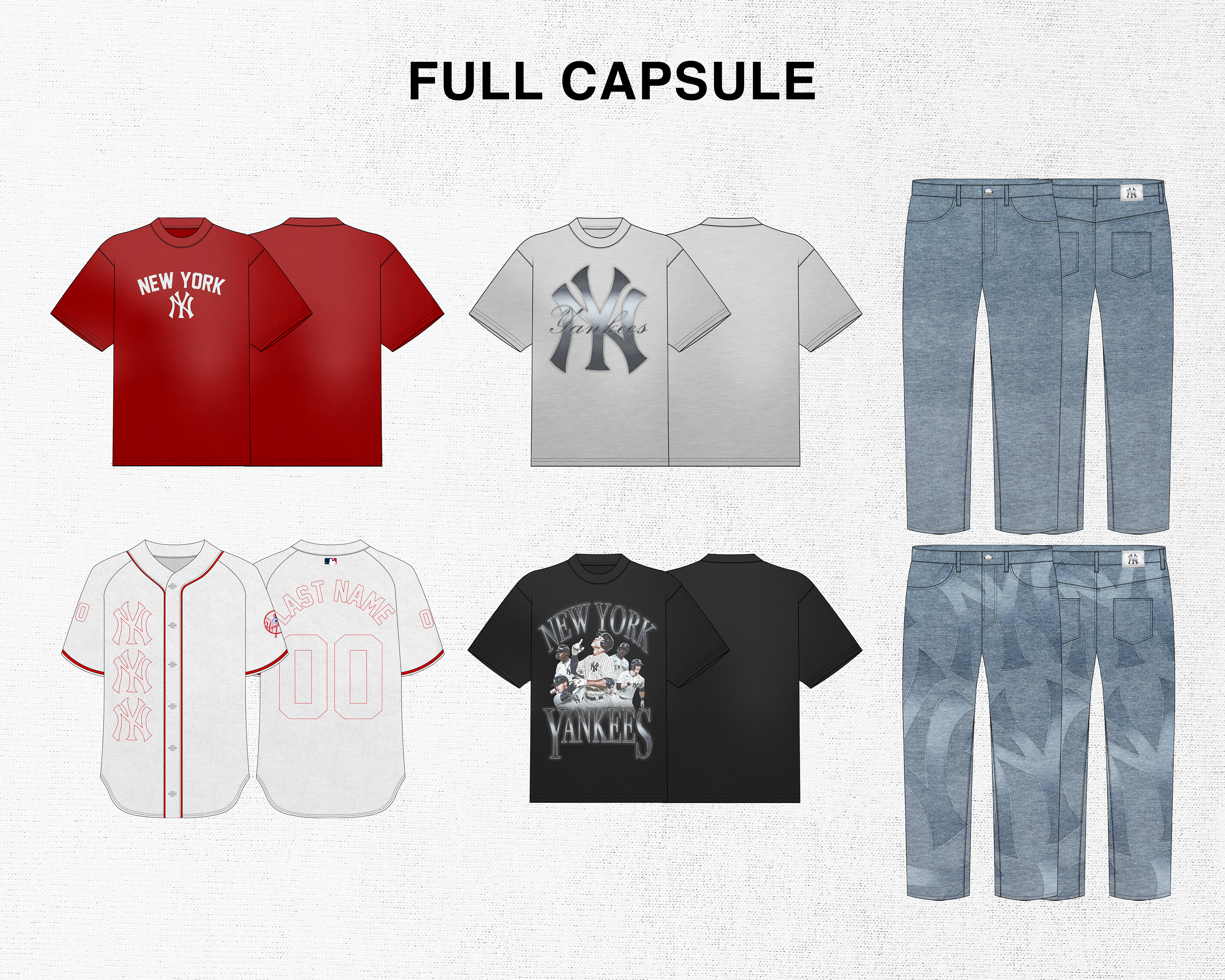 Yankees merchandise concepts inspired by vintage baseball apparel. The designs maintain a classic look throughout the entire capsule, incorporating denim prints and unique graphics on all the shirts.