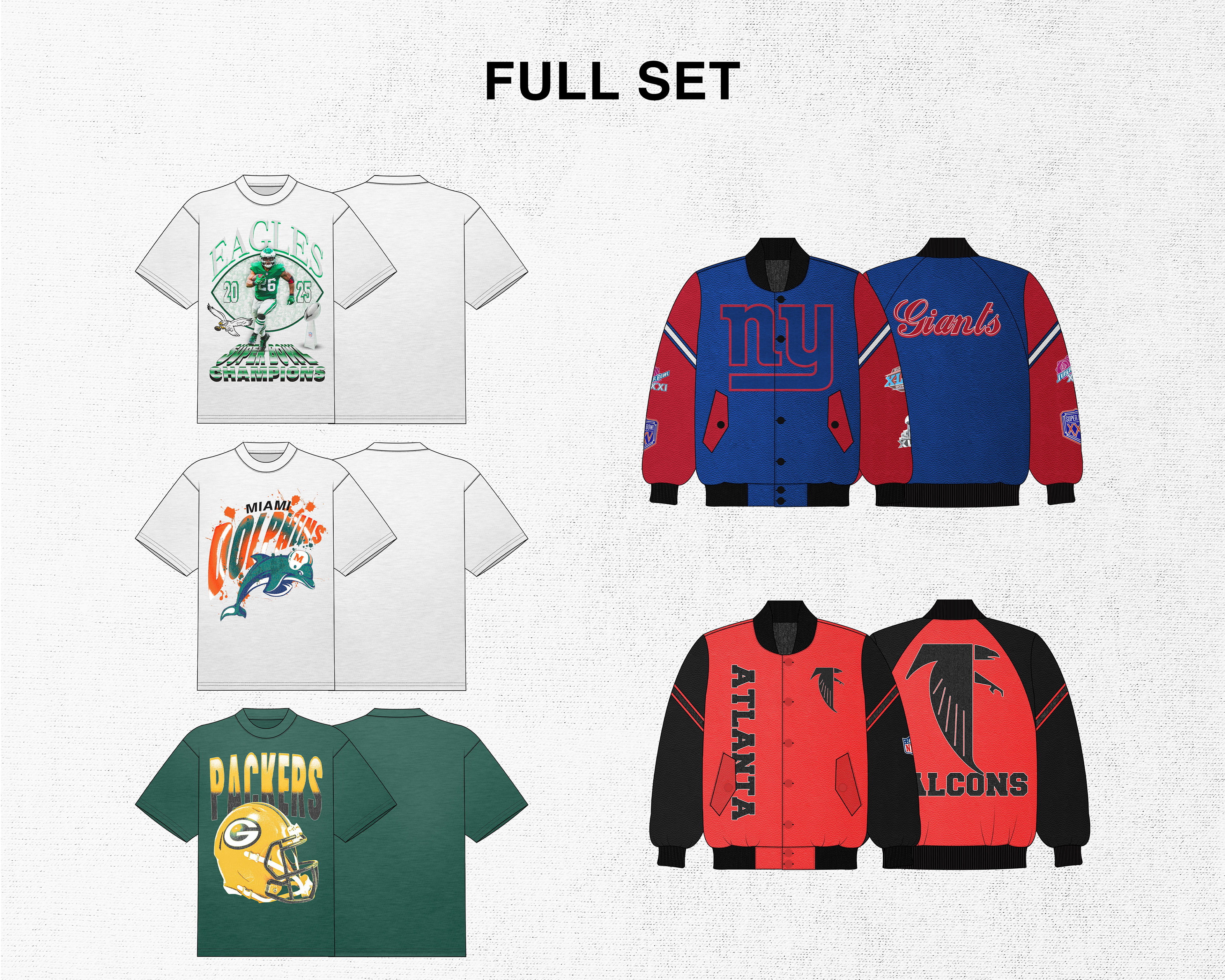 A collection of vintage style jacket and tee shirts concepts for 5 teams (Giants, Falcons, Dolphins, Eagles, and Packers). For each team I focused on referencing older graphics and merchandise, giving them a fresh look.